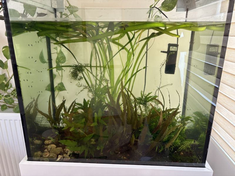 Mobilyası ve boyutu resimlerde de görünmektedir. Akvaryumda çok sayıda bitki, çok sayıda kiraz karides bulunmaktadır. 10-15 adet ember tetra, yaklaşık 10 adet neon tetra, birçok helena salyangoz mevcut. Otomatik yemleme makinası (Dolphin AF013), 2 adet motor (resimde görünen motordan iki adet mevcut), 1 adet şelale filtre, 2 adet ısıtıcı, yemler, sıvı gübreler, bol miktarda filtre malzemeleri ve aksesuarları tüm set halinde satılıktır. Ekosistemi oturttuğum için filtrelere ihtiyaç duymuyorum. Temizlik sonrası 1 gün motoru çalıştırıyorum.