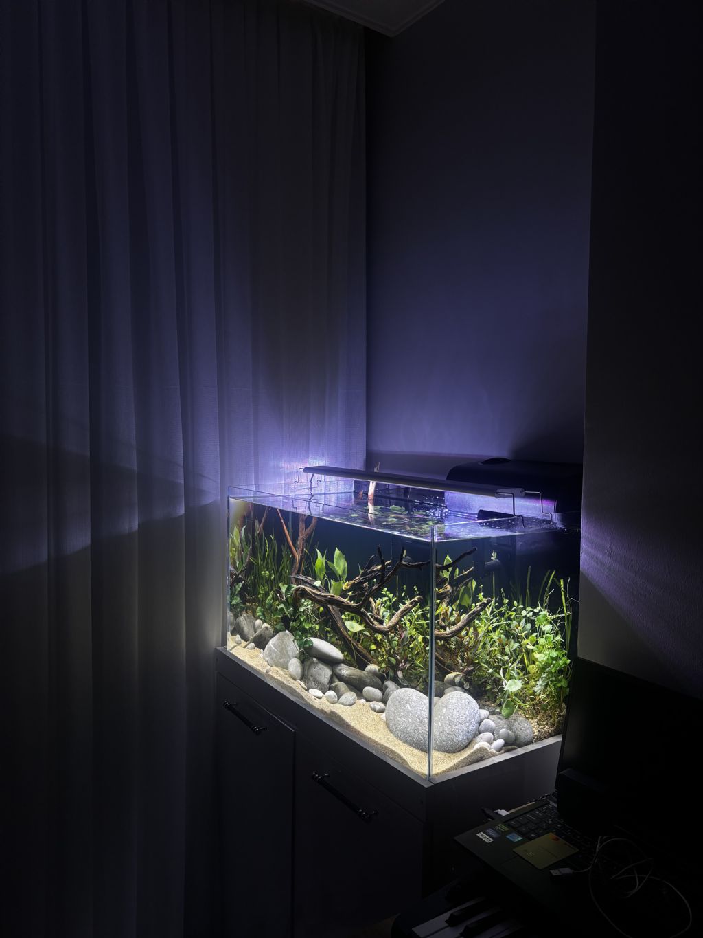 Zeminde tatilde Datça Palamutbükü’ nde sahilden topladığım kayaları kaya tuzunda bekletip güzelce temizleyip durulayarak kullandım. Önde görüntüsünü sevdiğim 0.5 silis, arkada ise 3mm dere kumu bulunuyor. İki kumun karışmaması için taşları bariyer gibi kullandım ve dere kumunun altında yaklaşık 10 ar cm aralıklarla taban gübresi bulunuyor. Suyu doldurduktan sonra bakteri kültürünü üreticinin verdiği oranlarda kullanmaya devam ediyorum. Bitkilerin ekimini yaptım ve bugün 5. gün günlük %20 su değişimi yapıyorum. Suyumun artık hazır olduğunu düşünerek balıkları yakın zamanda eklemeyi düşünüyorum. 6 lı cory grubu 4 cüce vatoz ile ilk balıkları eklemeyi planlıyorum. Sonrasında 1 çift Elektric Blue Acara ve 1 grup henüz karar veremediğim ( Acaraların gece eksiltemeyeceği kadar büyük) tetra türü ile akvaryumu tamamlayacağım.