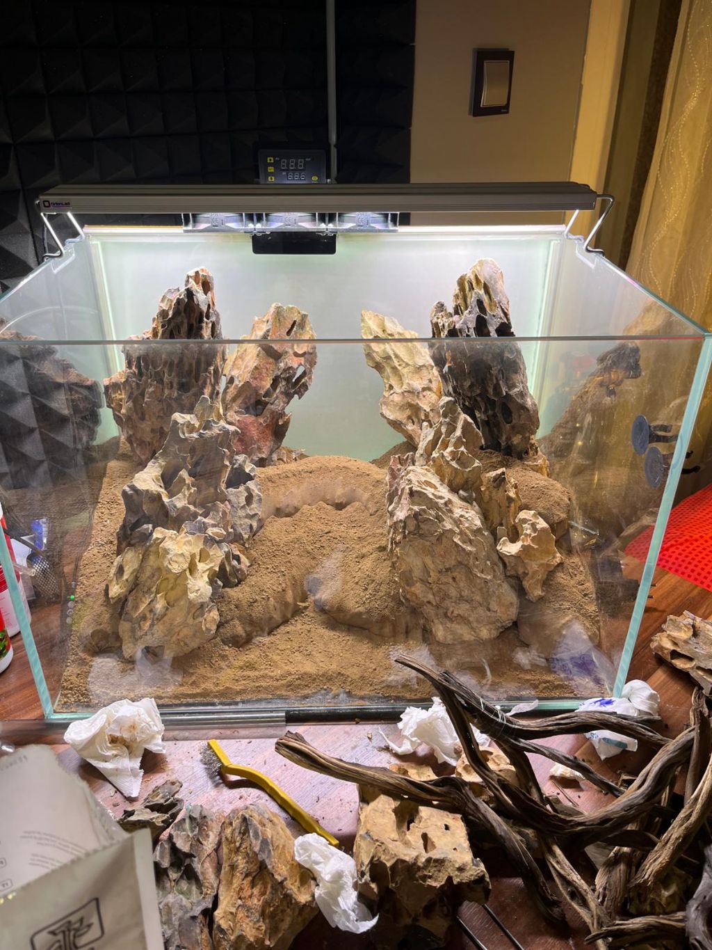 Eksi olarak gördüğüm kumlar! zamanla tamamı karışır. keşke sık bir file ile ayırsaydın yada bitkilerin olduğu yere arkaya soil bir setle önede silis koysaydınız daha iyi olurdu. Kaya olarakda lav kayası çok yosun ve pislik çok tutar su değişimi ve dip çekimlerini özellikle aksatmayın. İyi hobiler.