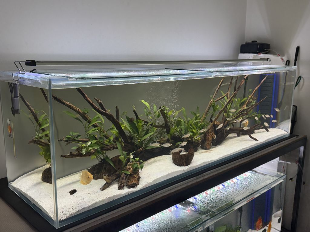 Balıklarınız sağlıklı görünüyor, ancak sayıları az. 5-6 adet olmaları daha uygun. Alttaki linkteki discus rehberini,yazılarını okuyun. Tankta dekor değişikliği yapmayın, gereksiz stres yaratır. Sadece nilüfer,saz,cryptocoryne gibi yüzeyde gölgelik yapan birkaç bitki ve çok ince dalı olmayan kütük gibi öğeler kullanın, balıkların saklanabilmesi için imkan sağlar,stresi azaltır. Sıcaklığın 28-29 altına inmesine pek müsade etmeyin,yüksek sıcaklık bitkilerin hoşuna gitmeyebilir. Akvaryumcuda beğenip ithalattan yeni gelmiş tetra vs gibi türler eklemeyin derim