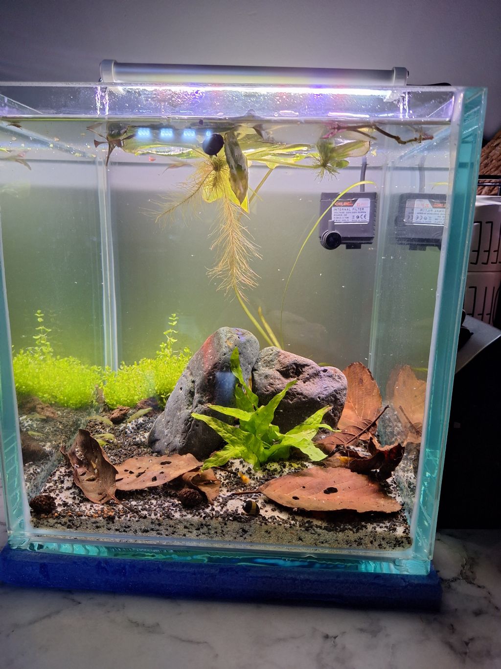 Ölçüler: 25 cm Küp Canlı Türleri: Altın gurami bebekleri, turuncu sakura karides, nerite ve minare salyangozları. Bitki Türleri: Micranthemum Micranthemoides, Cryptocoryne Wendtii ,Vallisneria Spiralis Red, Windelov Java Fern ve pistia. Tankın Yaşı: 2 Hafta Filtrasyon ve Işıklandırma: 5w iç filtre ve wolfmar 20 cm aydınlatma. Tasarım ve Dekorasyon: birbirine yaslanmış iki gamlı taş, biraz bitki biraz yaprak...